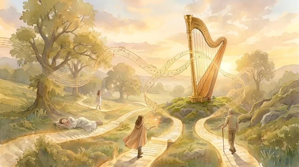 所以當豎琴的聲音傳入你的耳朵,你的身體會認得這種規律。它溫柔、不入侵,卻深深地觸動你。